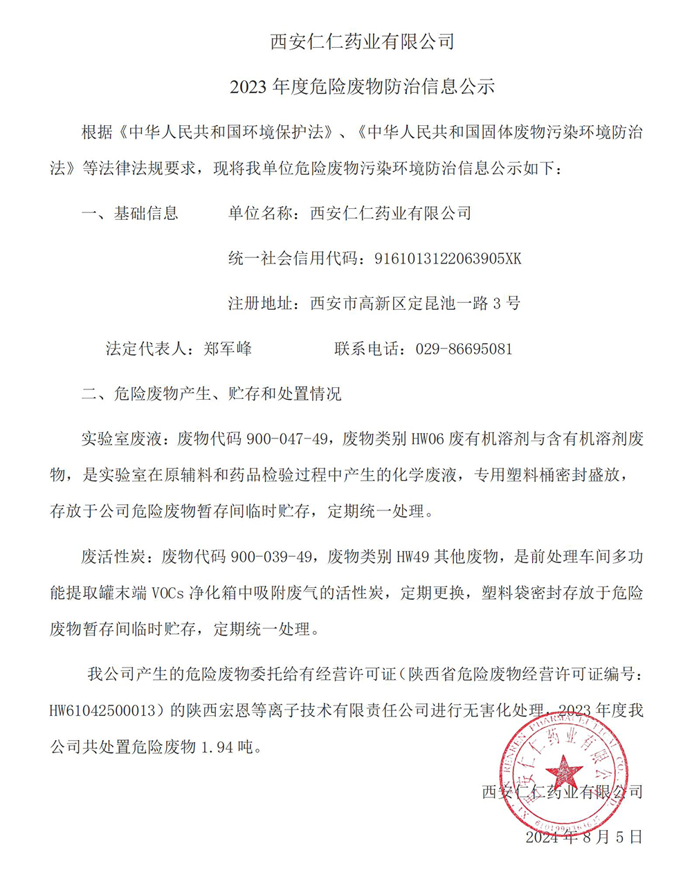 2023年度危险废物防治信息公示
